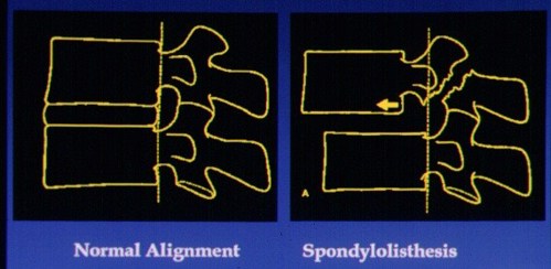 Spondylolysis (is due to an abnormality in the neural arch) and if bilateral can result in forward slip of one vertebra over the other (spondylolisthesis).