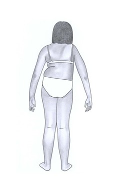 Note the figures below - the graphic on the left showing the asymmetrical skin creases and raised shoulder on one side - these are clues of a scoliosis, which may be more obvious on forward bending (right hand figure).