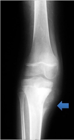 The radiograph below shows the cortex changes and soft tissue swelling (arrow) of osteosarcoma in the proximal tibia